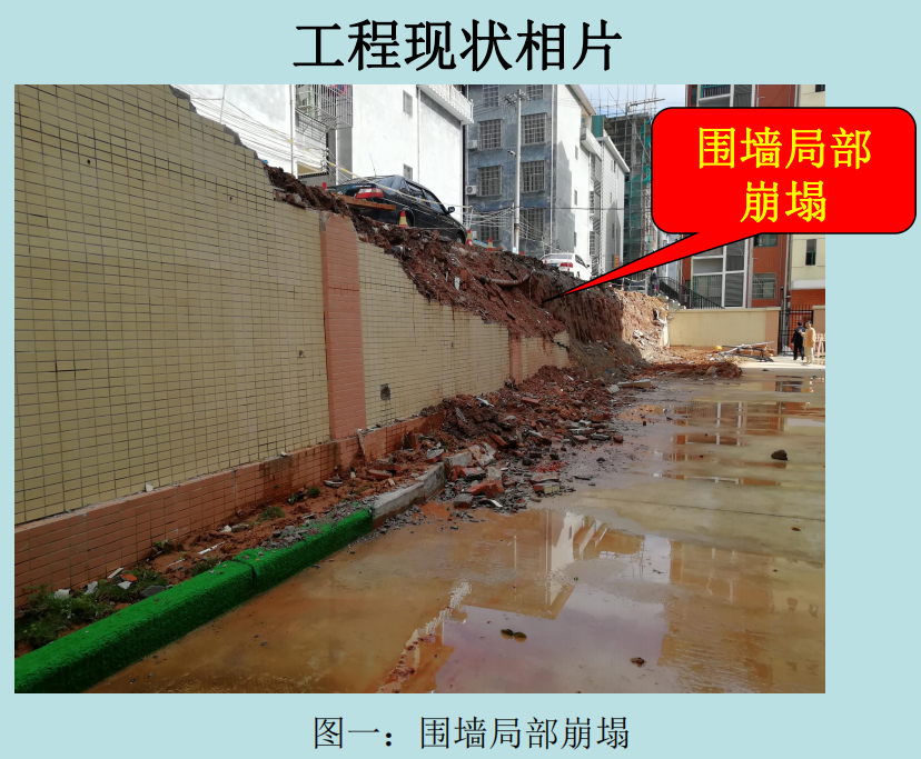 参照相关工程设计、施工质量验收规范、相关鉴定标准,经综合分析,兴国县第四幼儿园附属配套工程围墙尺寸和主体砂浆强度基本符合原设计图纸要求,此次围墙局部崩塌产生的主要原因是:前些日子兴国天气出现罕见连续大雨,雨量较大,加至围墙顶面与小区交接部位的道路排水汇水面较大,全部道路排水往围墙方向汇流,至使围墙土压力增大,导致围墙局部崩塌破坏,为确保该围墙的结构安全,后续使用方应请有资质单位进行挡墙设计,充分考虑恶劣天气影响,适当增加安全系数进行相关设计工作。房屋安全鉴定结束。