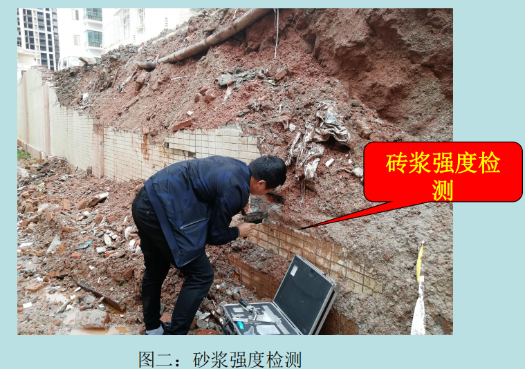 (2)现场主体强度检测情况:现场对围墙砂浆强度进行贯入法检测,砂浆强度基本满足原设计要求M5.0。